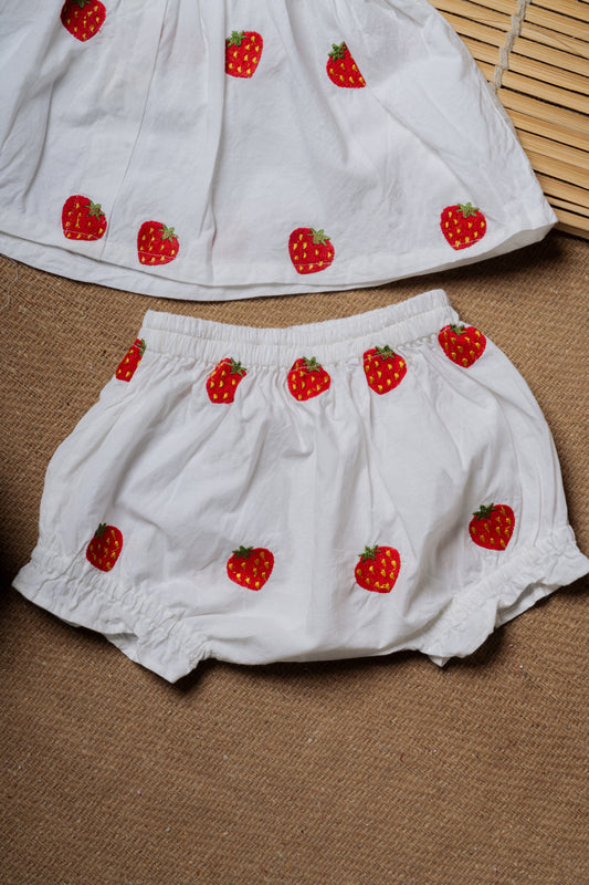 Strawberry Embroidered White Ruffled Baby Frock & Shorts