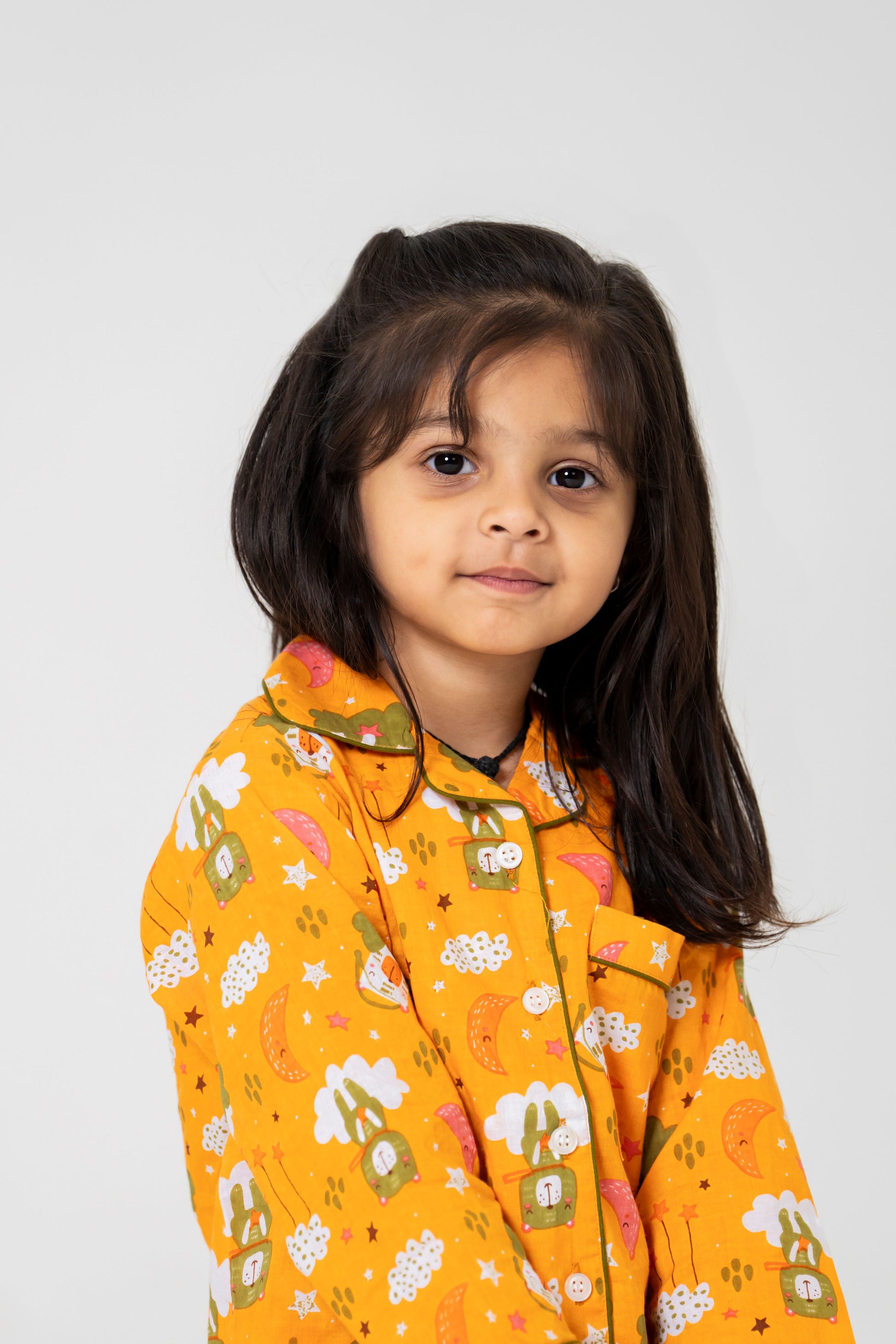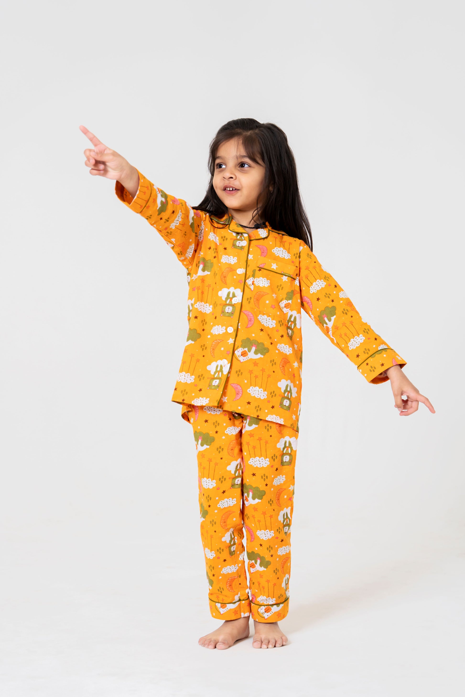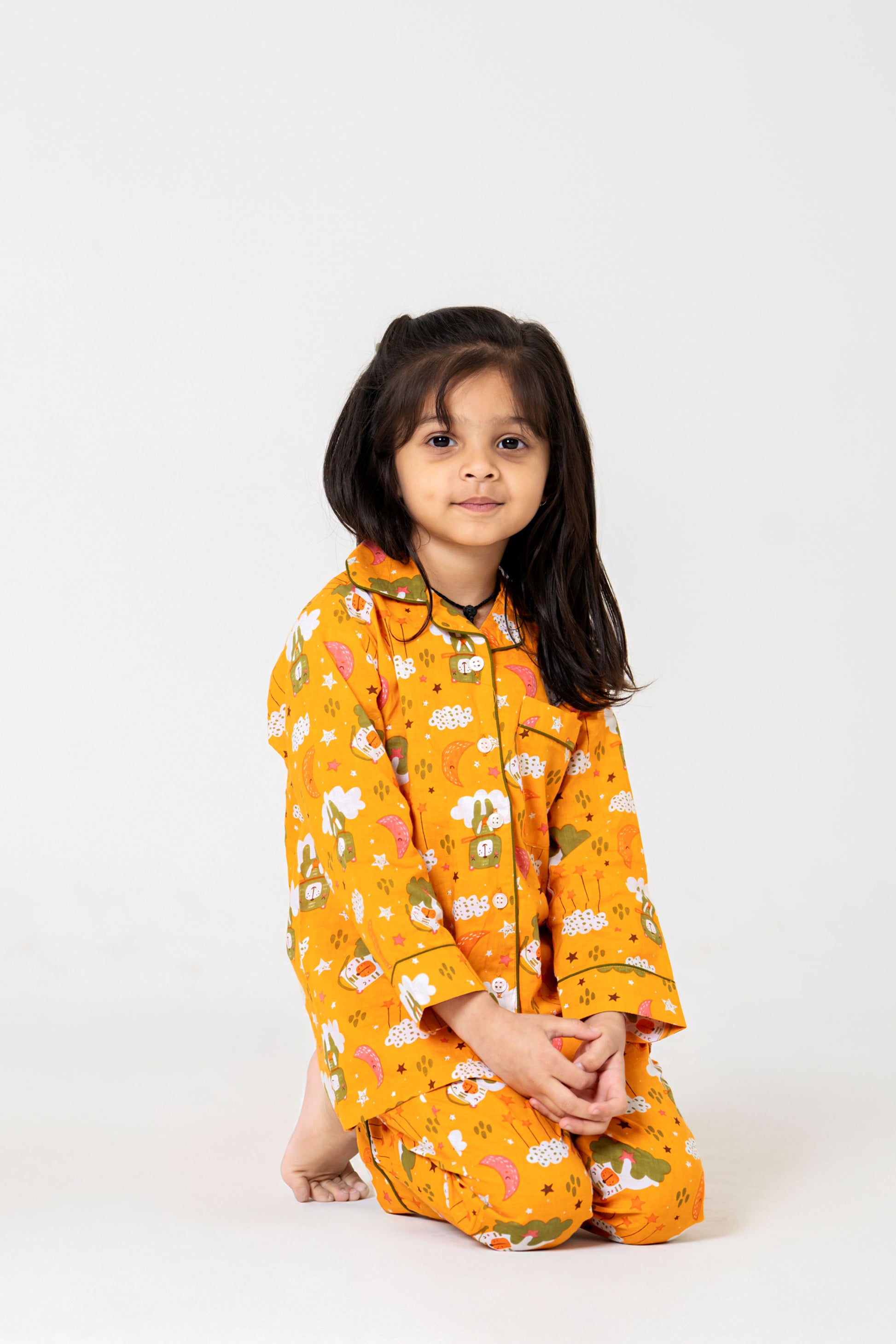 Make bedtime fun and comfy with this charming Orange Cartoon Print Night Suit Set. Crafted from soft, breathable cotton fabric, this set ensures a cozy feel all night long.