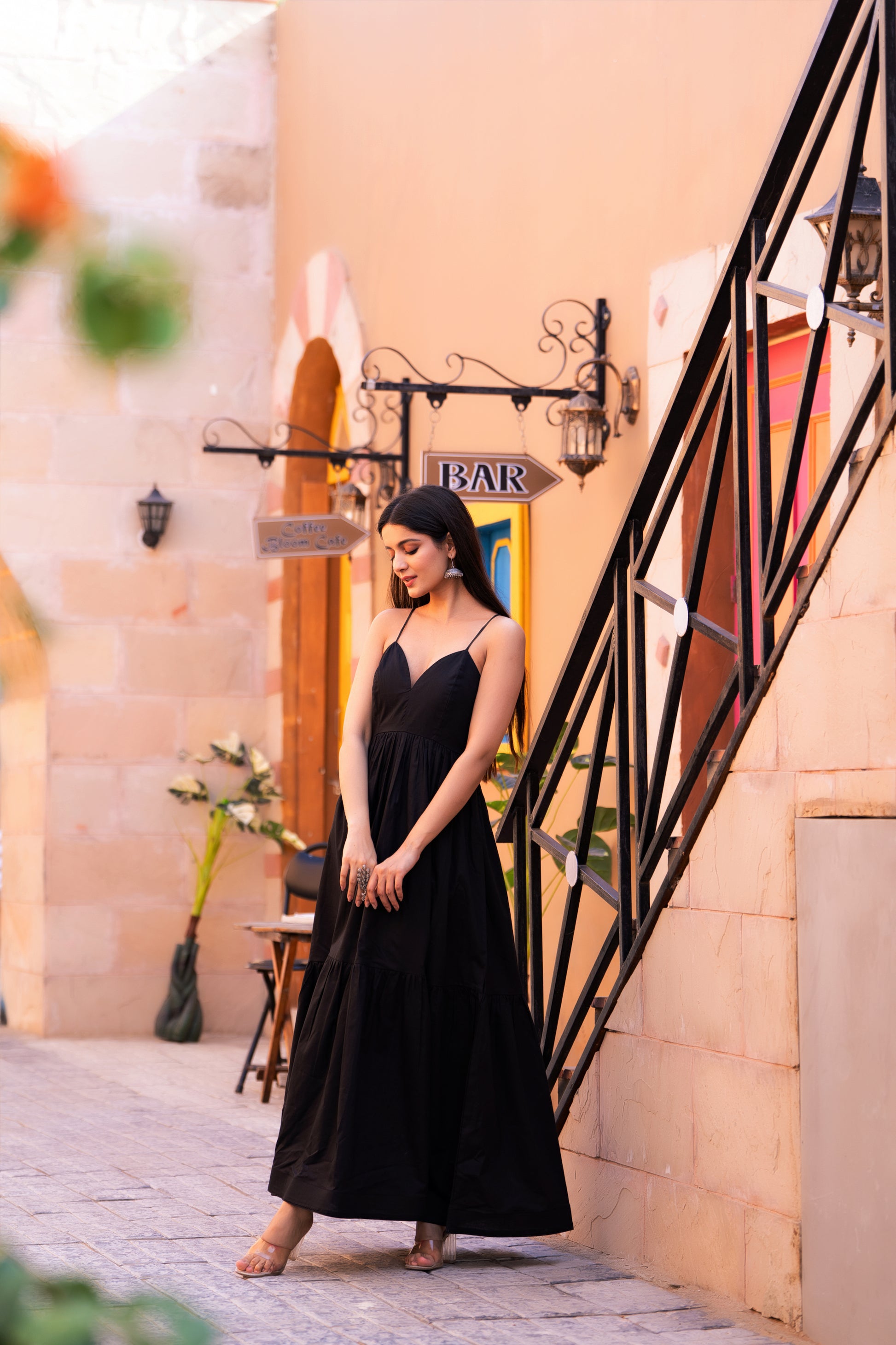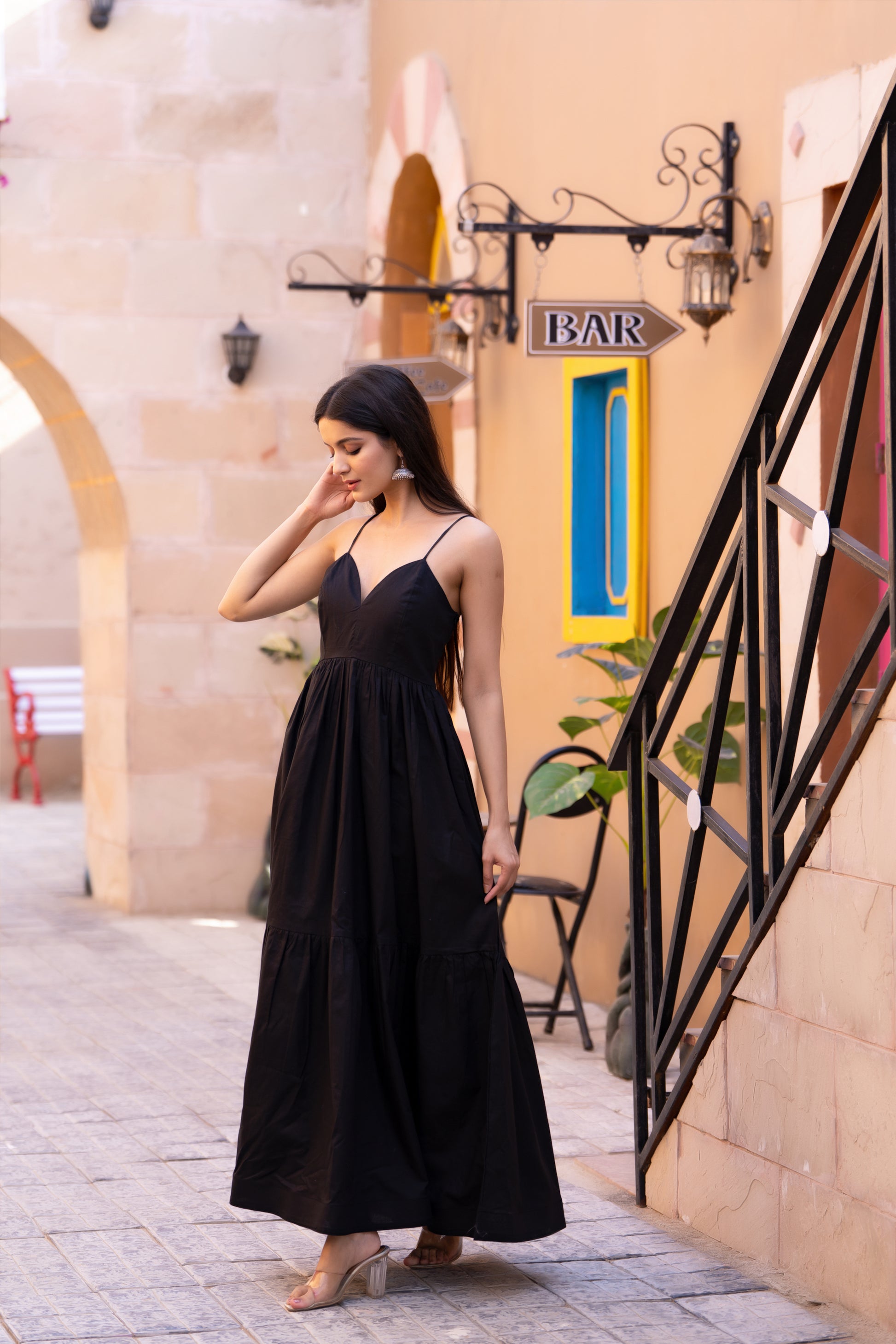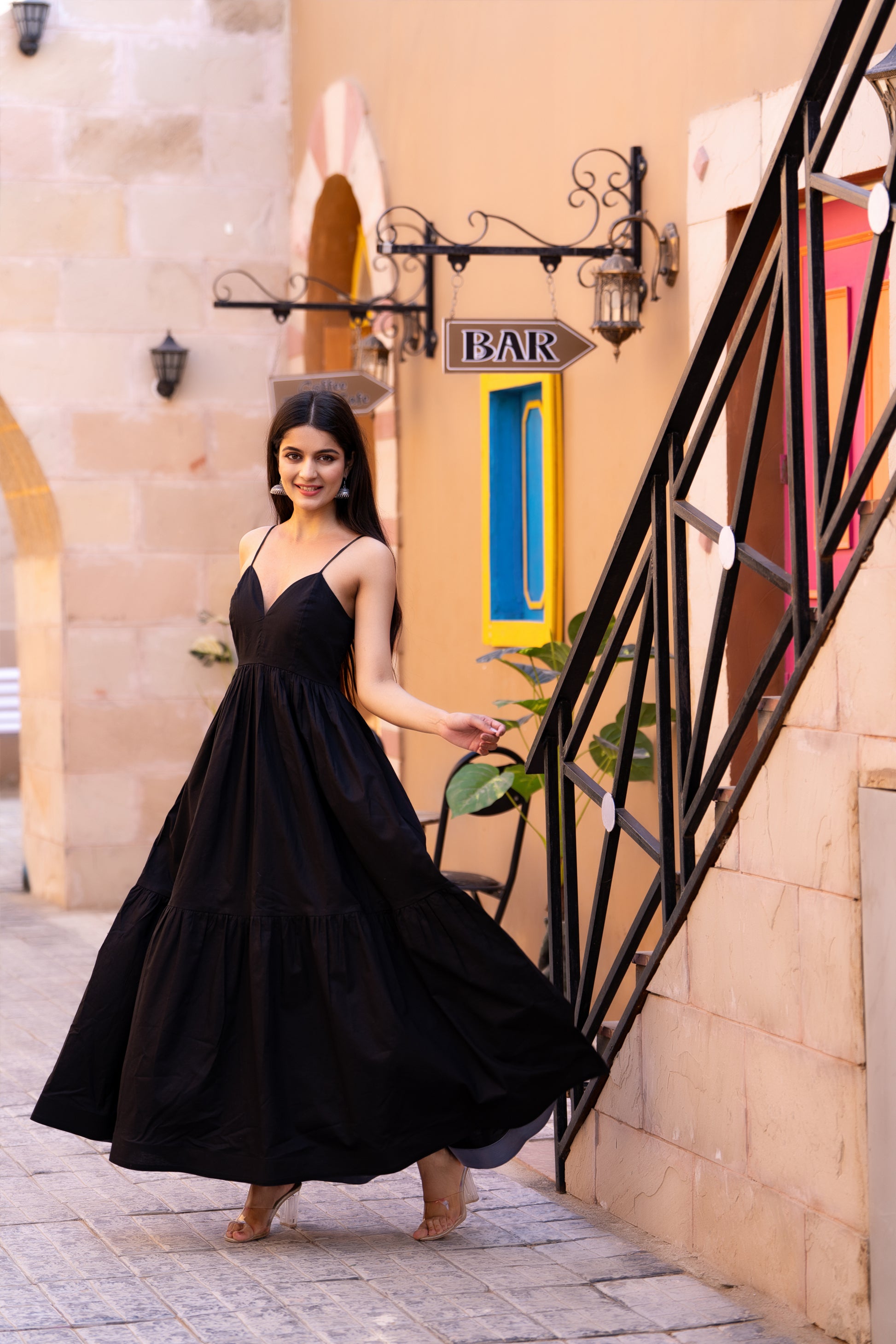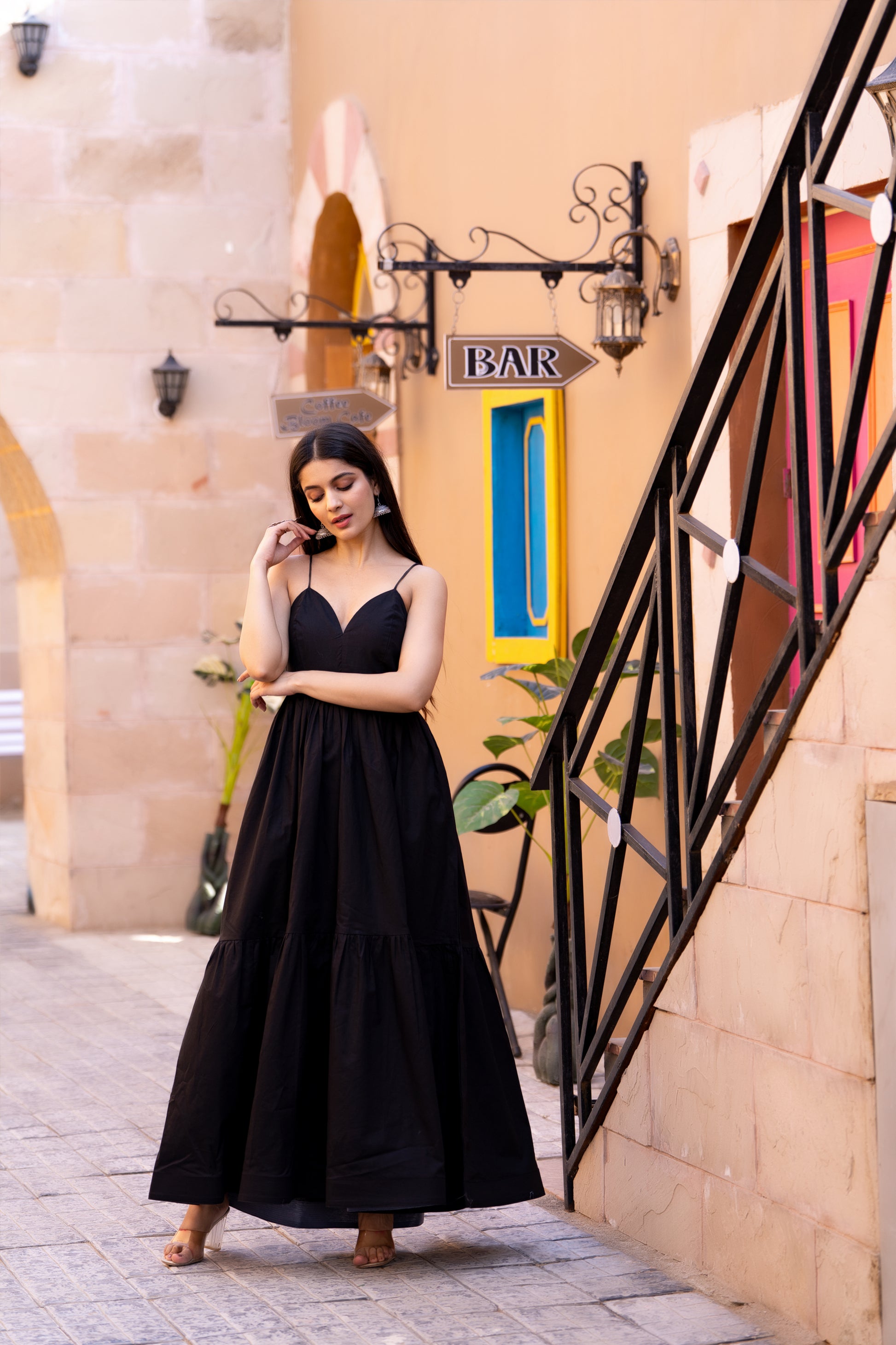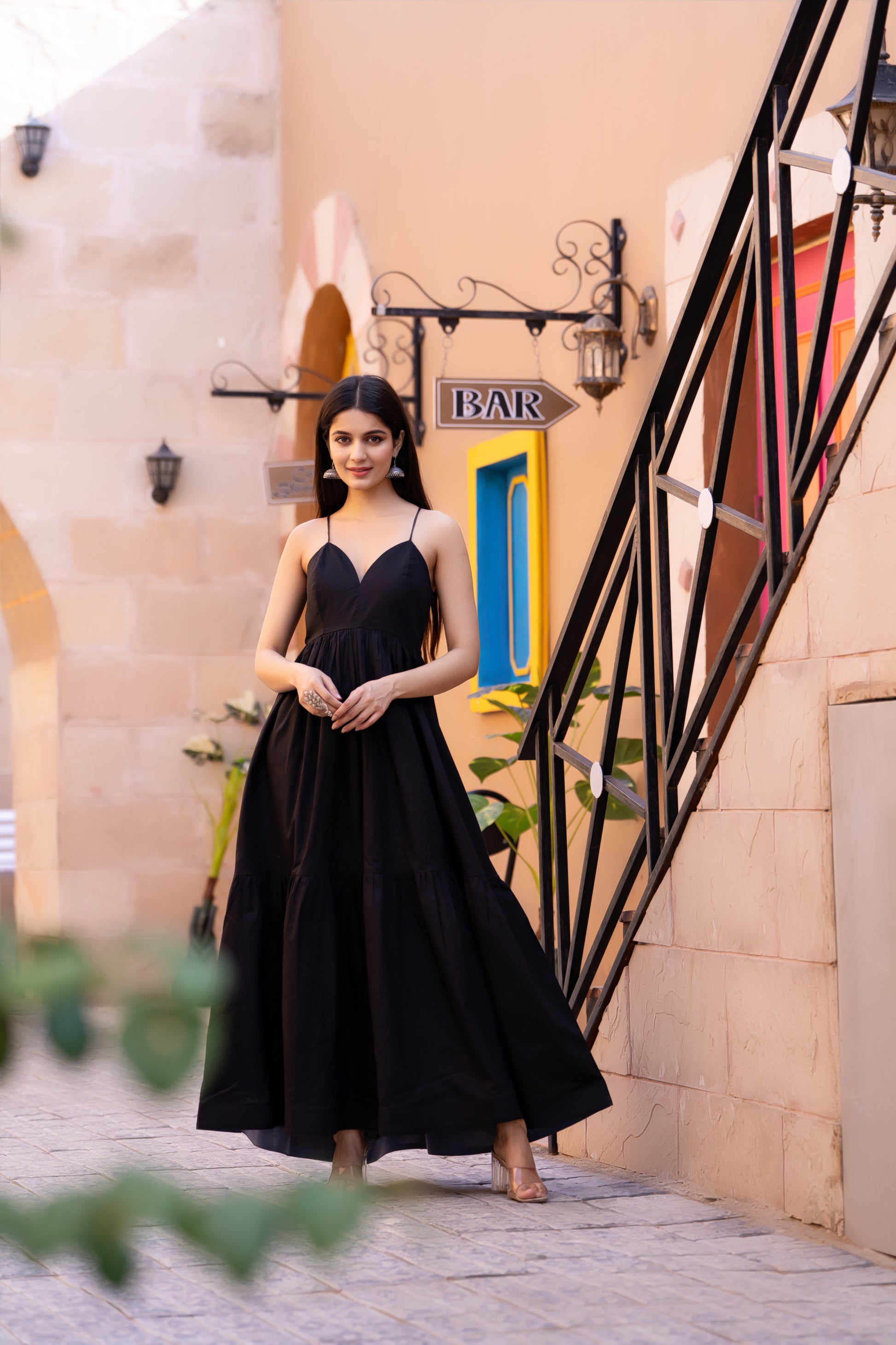 1 Multicolor Black Gown with noodle straps and double-sided pockets.