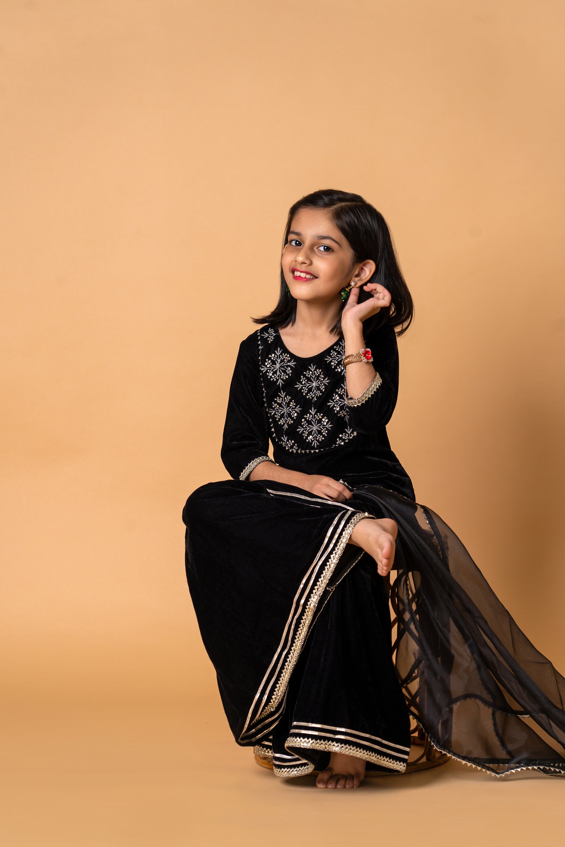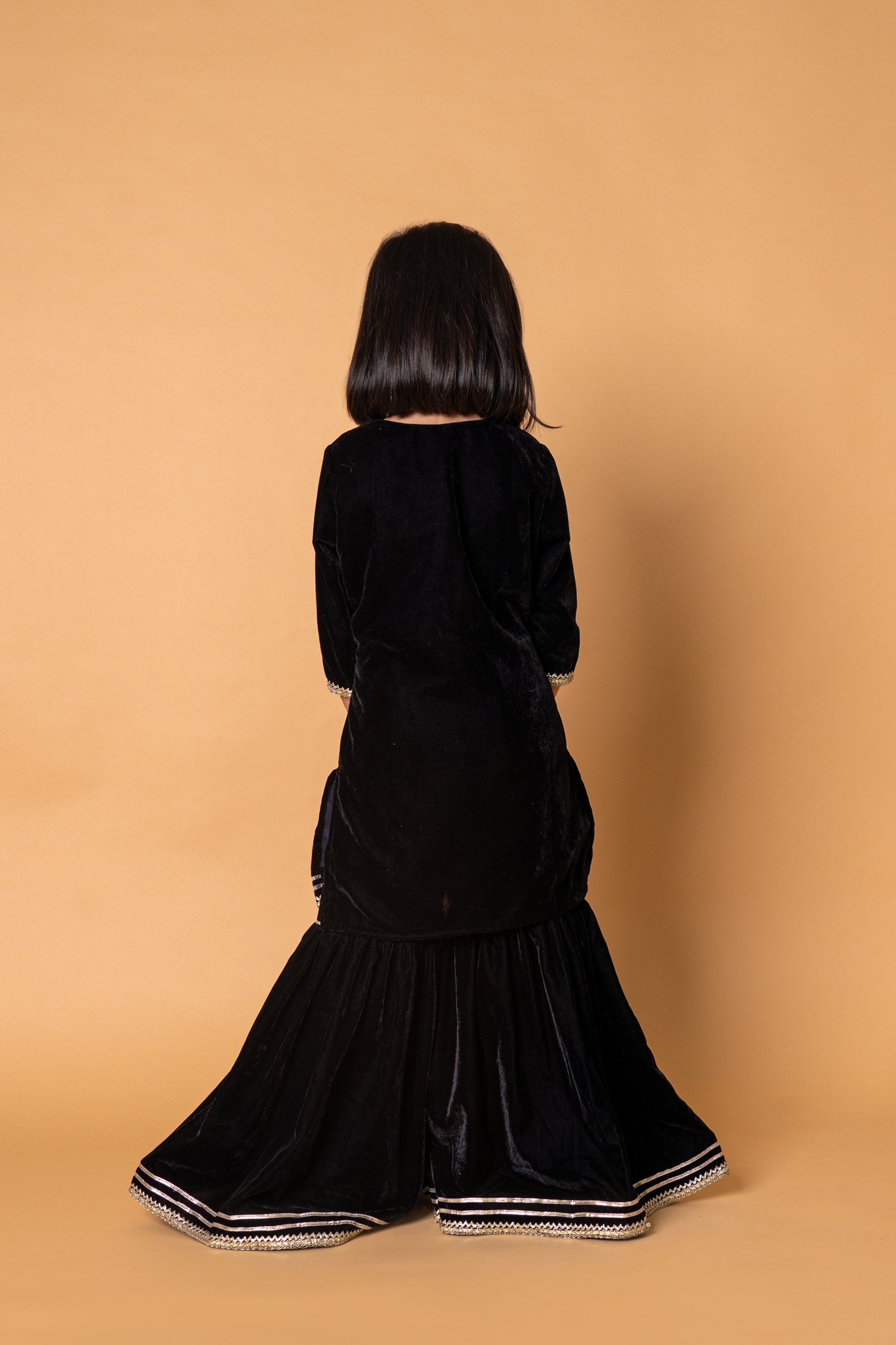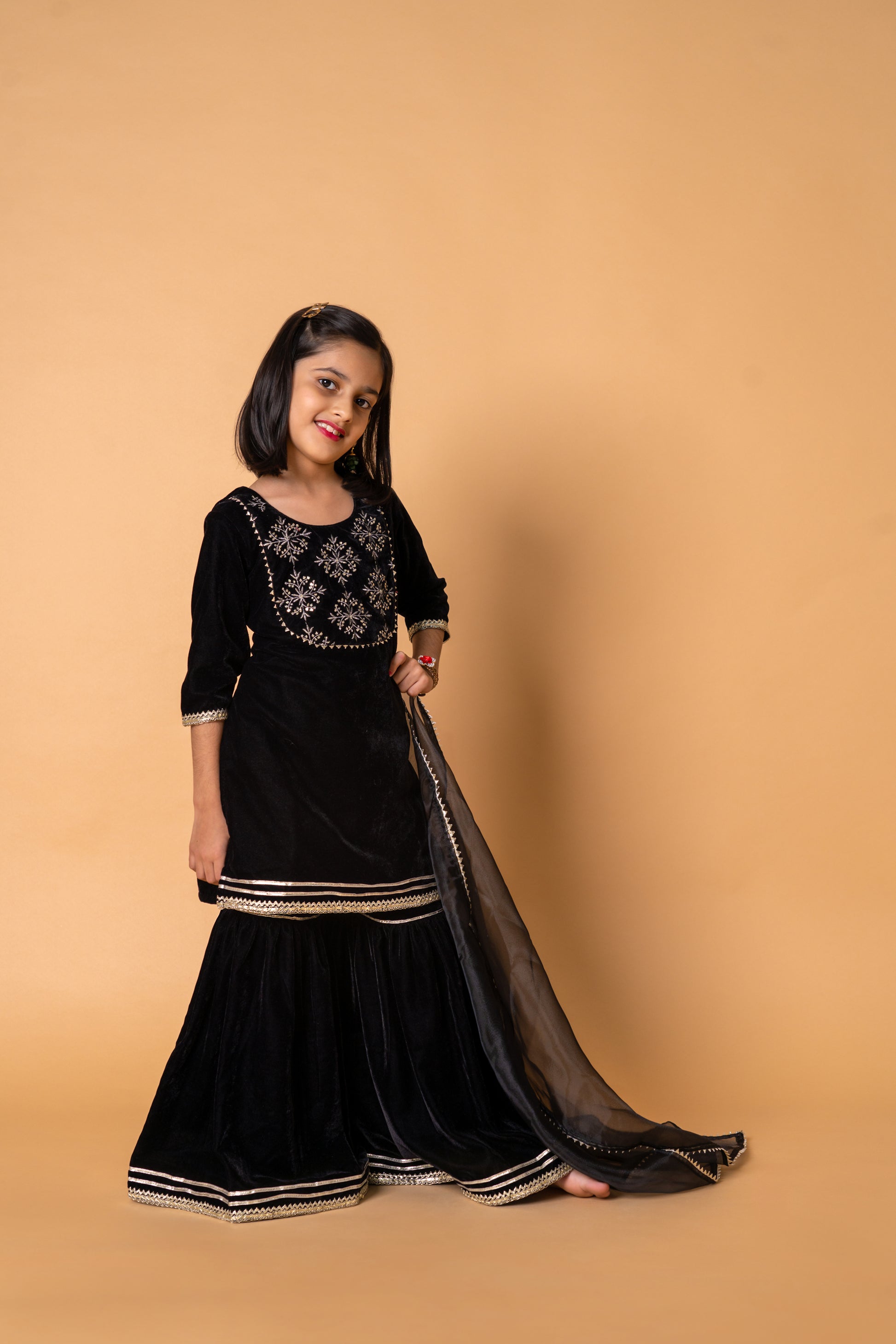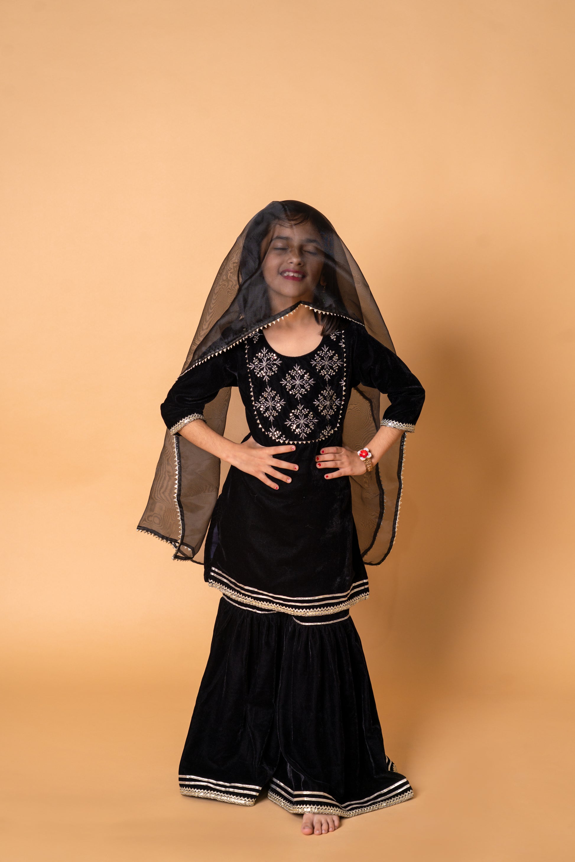 Black Velvet Printed 3-pc Kurti, Sharara & Dupatta Set for Girls