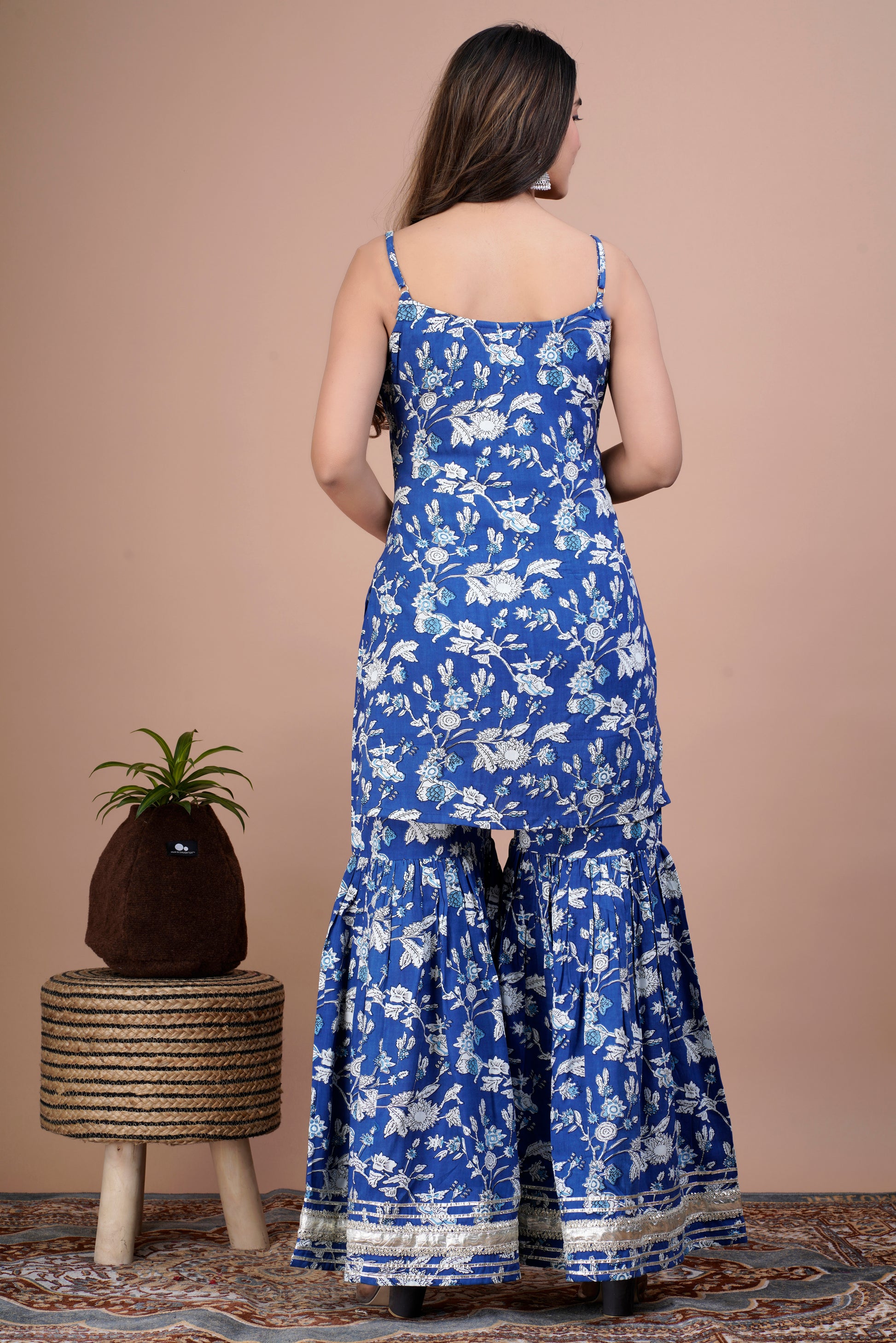 Blue Floral Mirror Work Kurta, Sharara and Dupatta Set