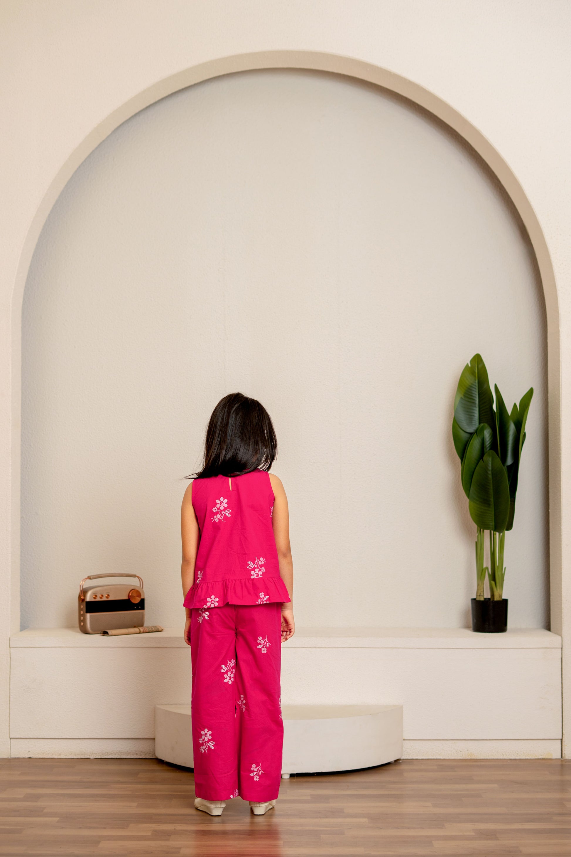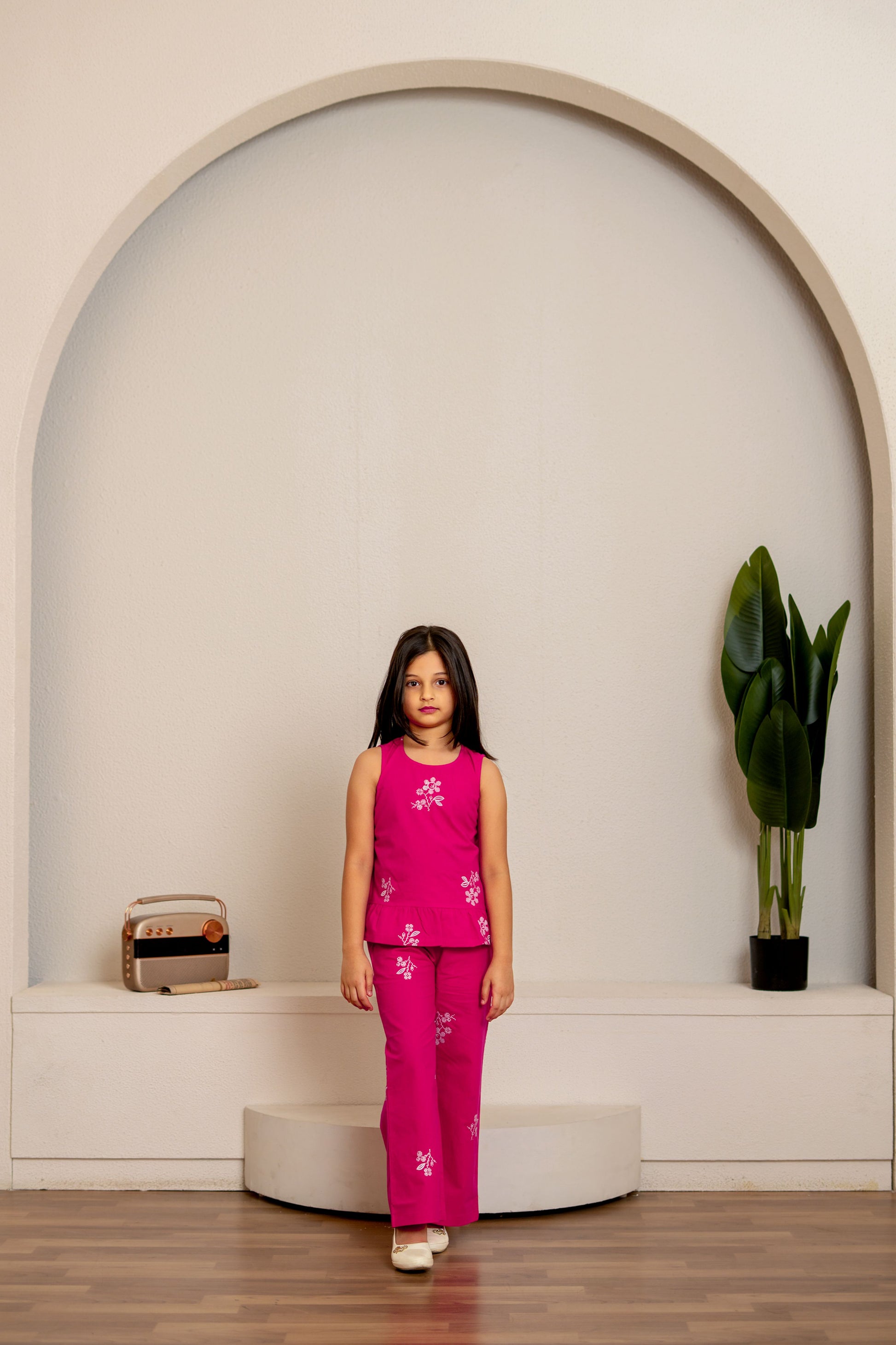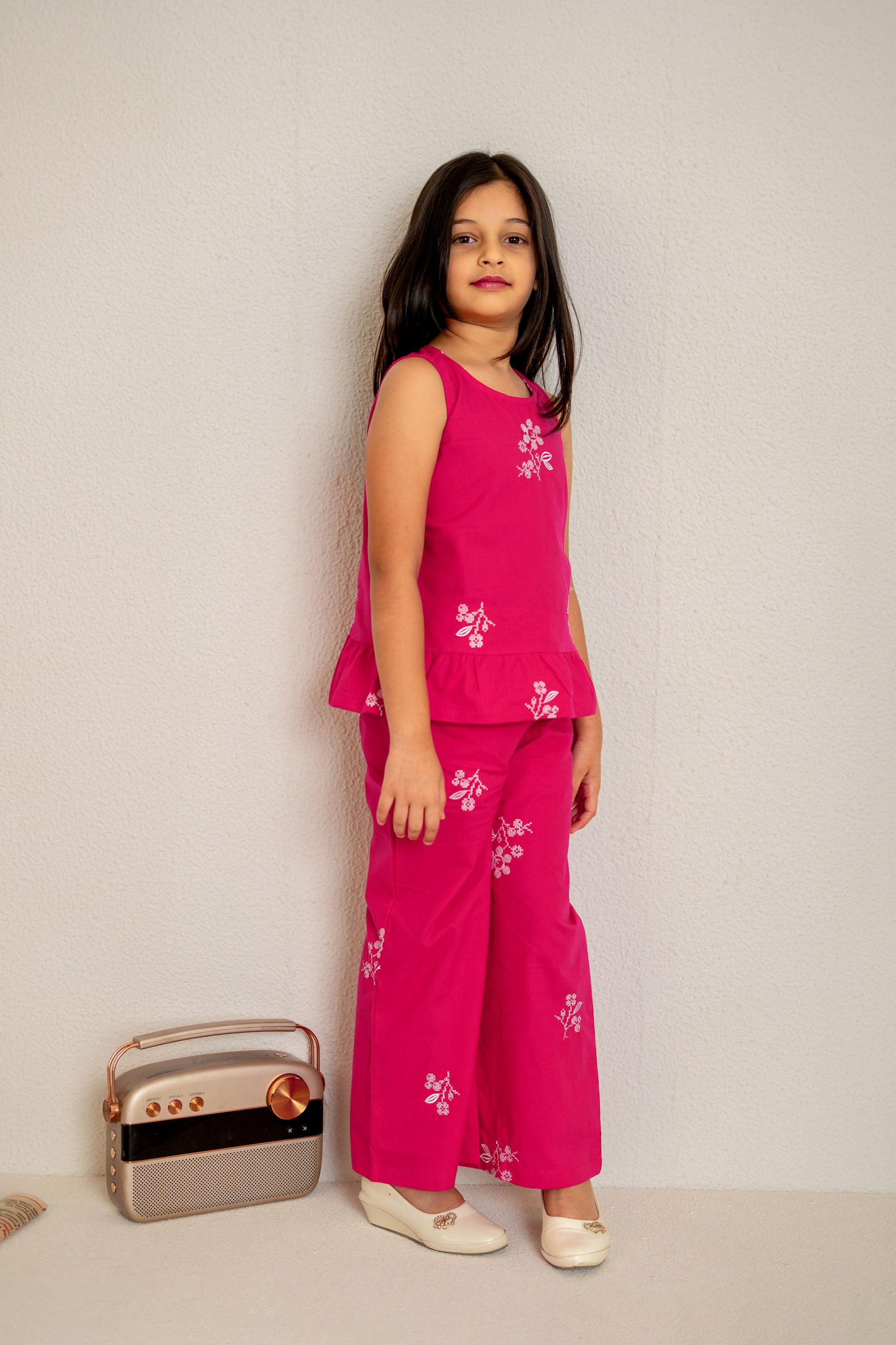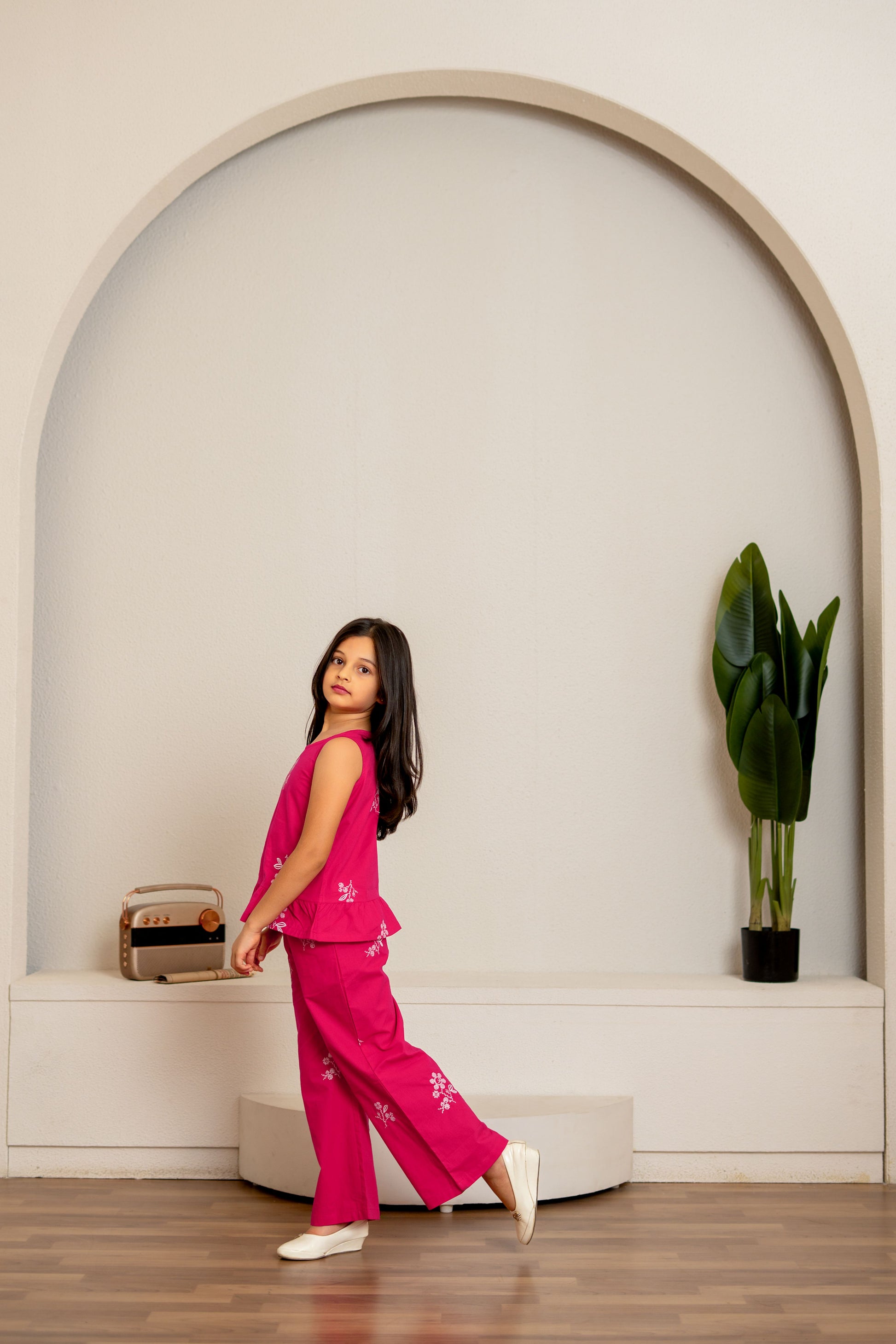 Let your little one shine in this Fuchsia Pink Embroidered Coord Set, designed to bring playful elegance to every moment. Crafted from soft, breathable poplin cotton, this sleeveless ensemble features delicate floral embroidery that adds just the right amount of charm.