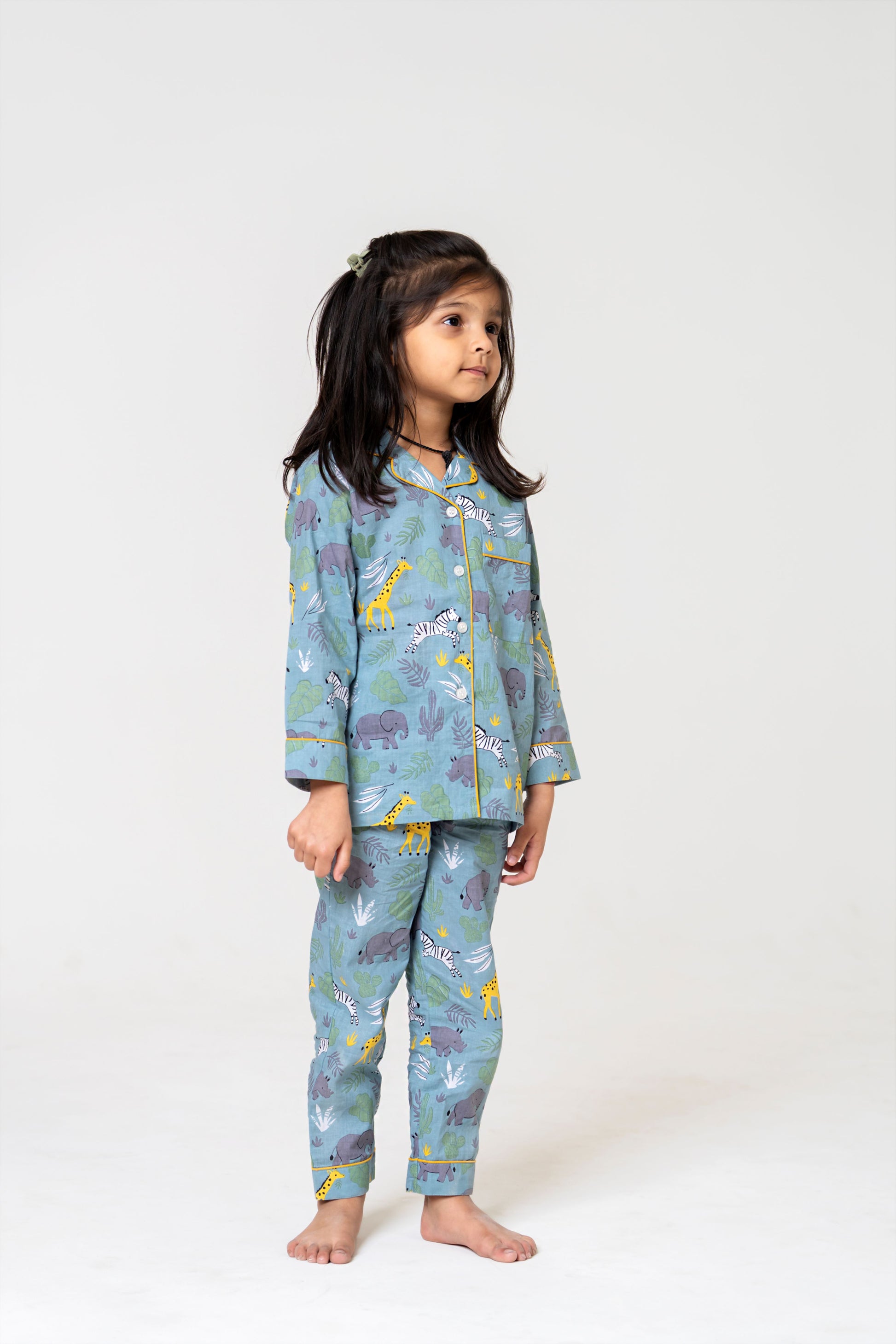 The classic collar neckline and full sleeves provide warmth and a snug fit, while the playful animal print adds a fun and lively touch — perfect for bedtime stories and pajama parties.