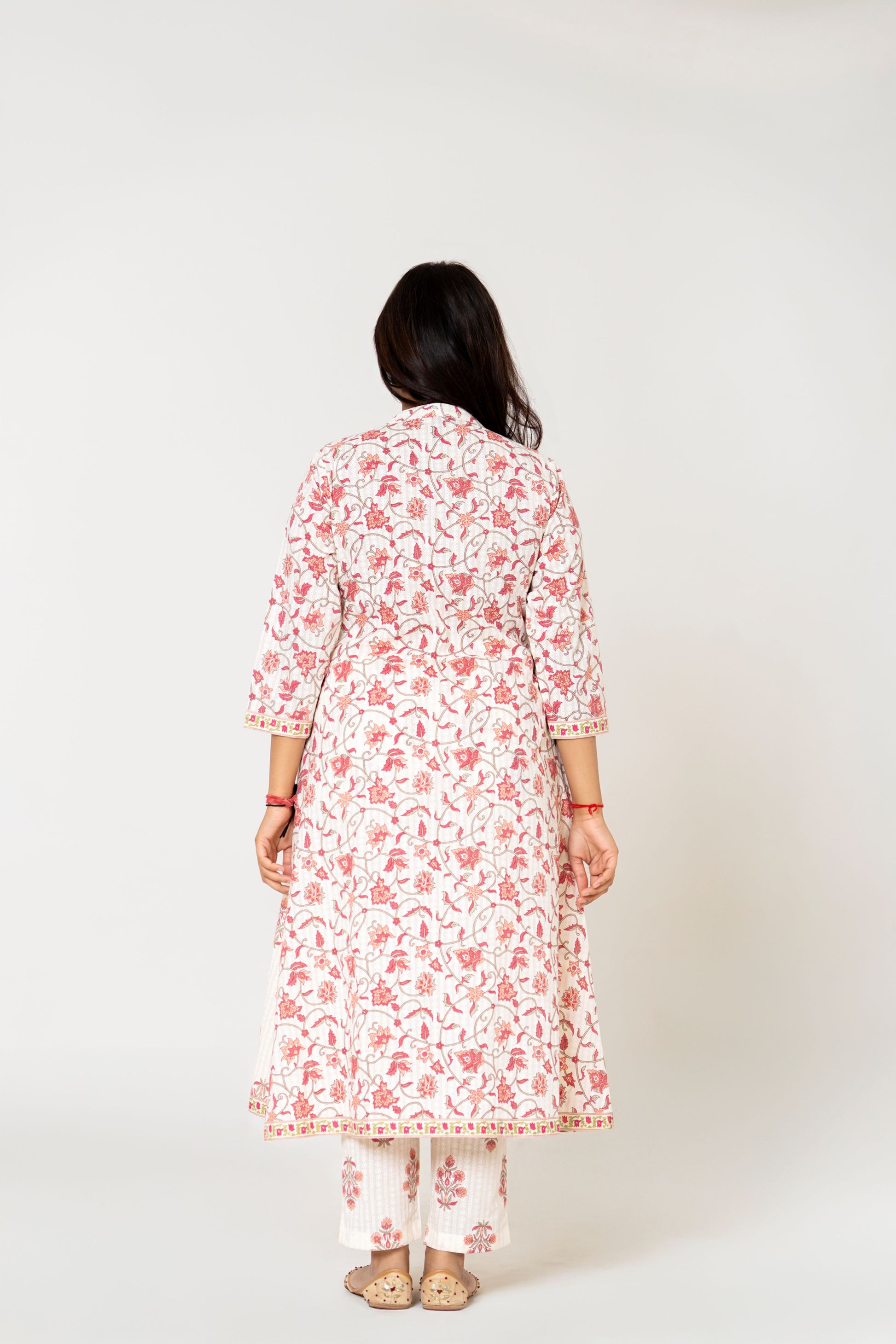 Embrace timeless charm with this beautiful Off-White Floral Angrakha Kurta, Pant & Dupatta Set. Crafted from soft, breathable cotton fabric, this set offers both comfort and style.