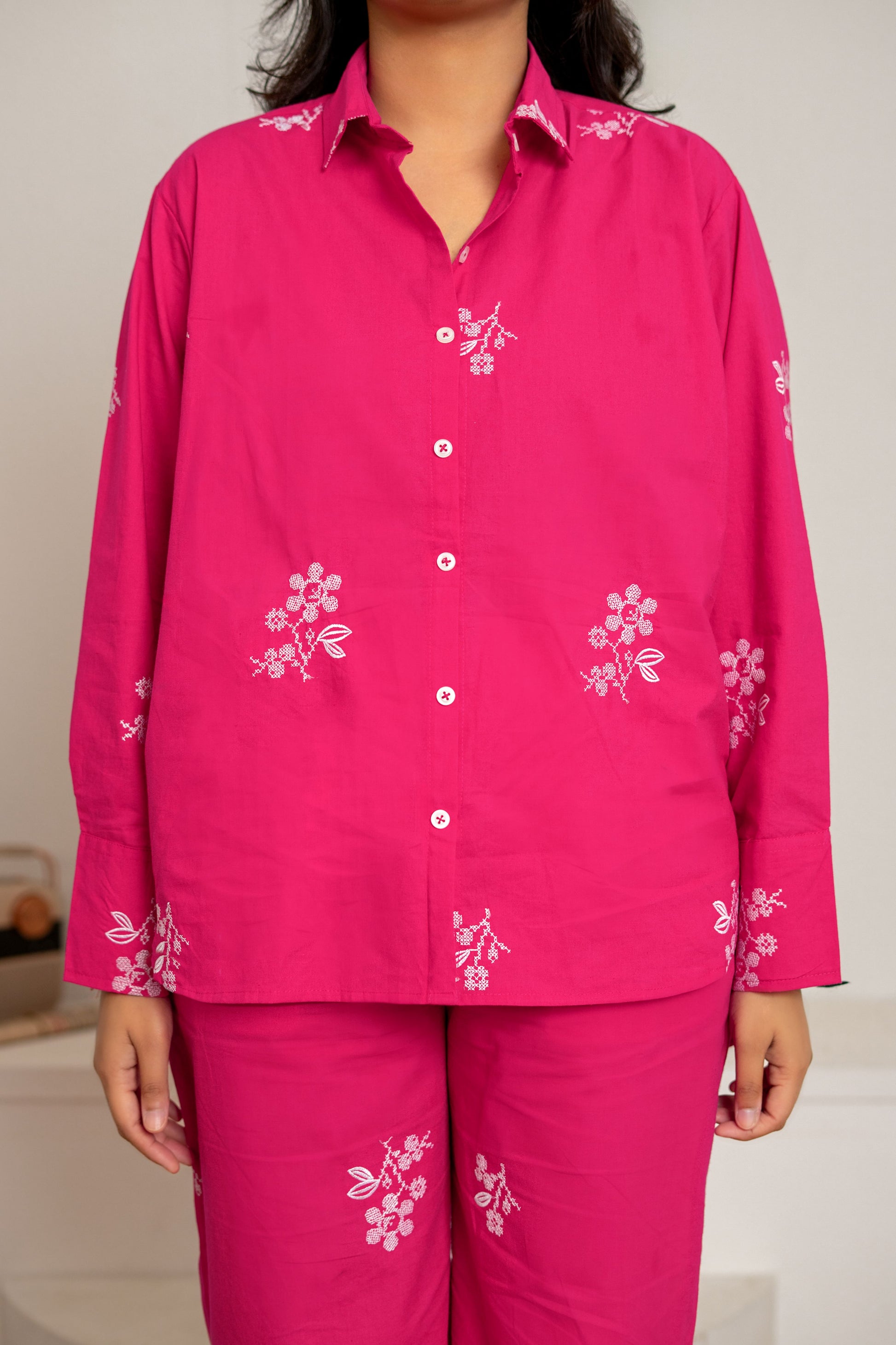 Step into sun-kissed style with this Fuchsia Pink Embroidered Coord Set, your go-to outfit for vacations, brunches, or breezy festive days. Crafted from airy poplin cotton, this full-sleeved set offers a graceful silhouette adorned with delicate floral embroidery — striking the perfect balance between vibrant and refined.