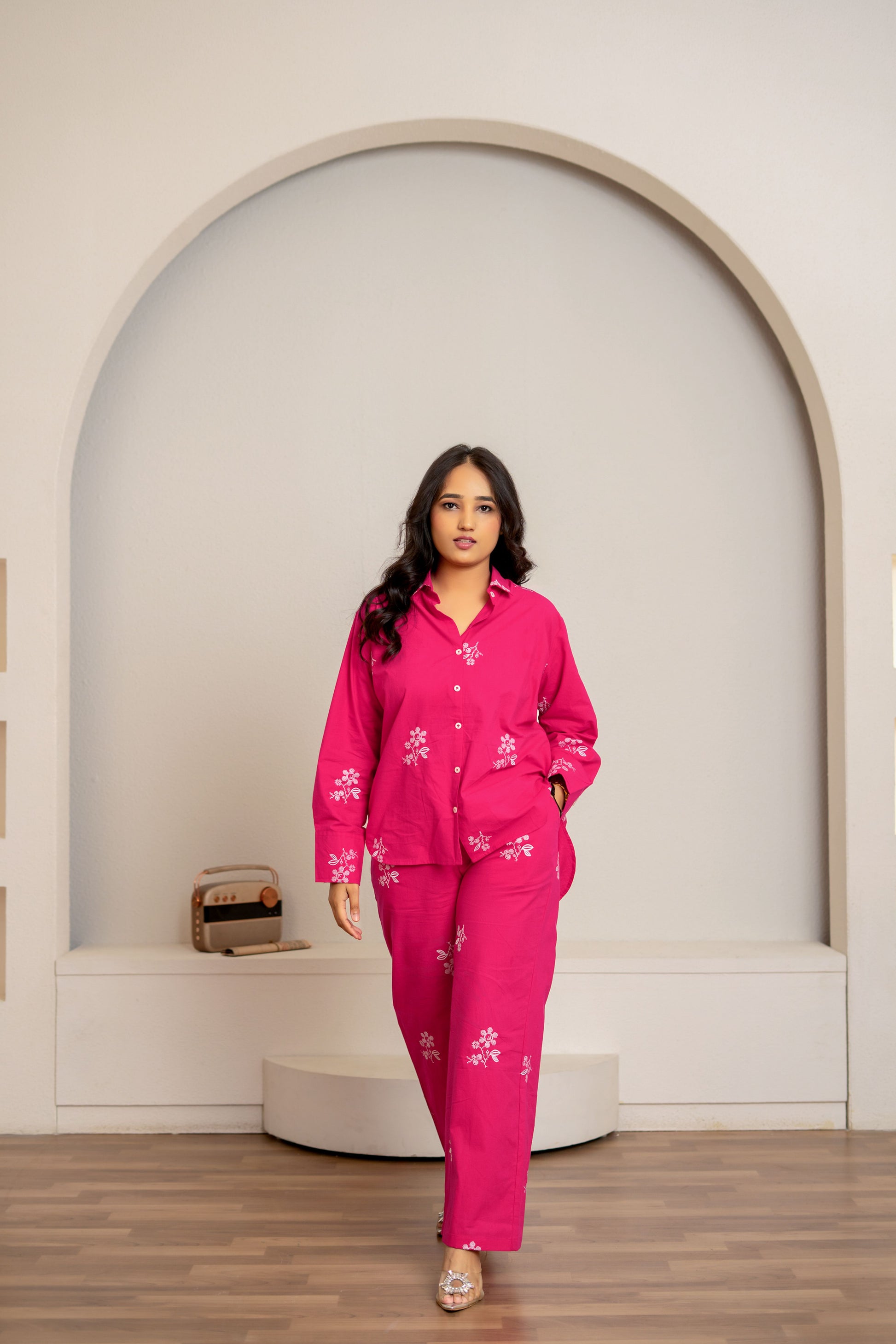 Fuchsia Pink Embroidered Co-ord Set – Resort Wear for Women