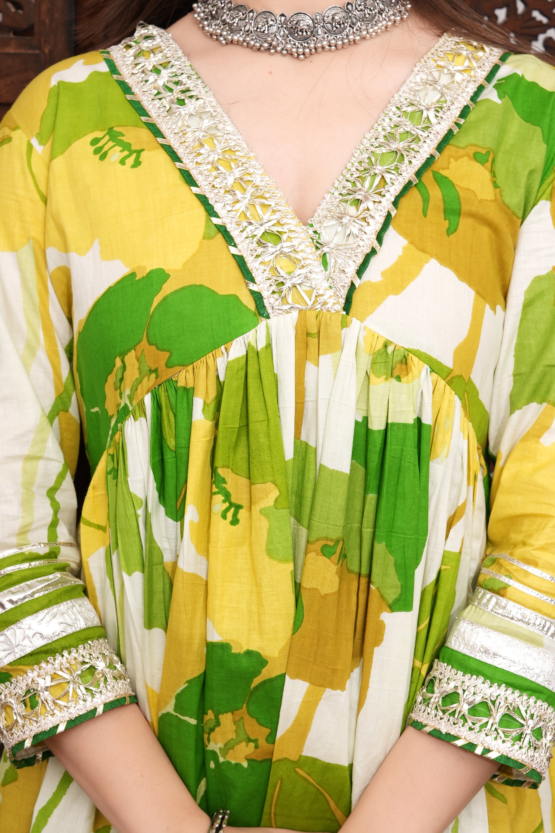 The detailed gota work done perfectly on neck, hemline and dupatta for your distinct style statment on special events.
