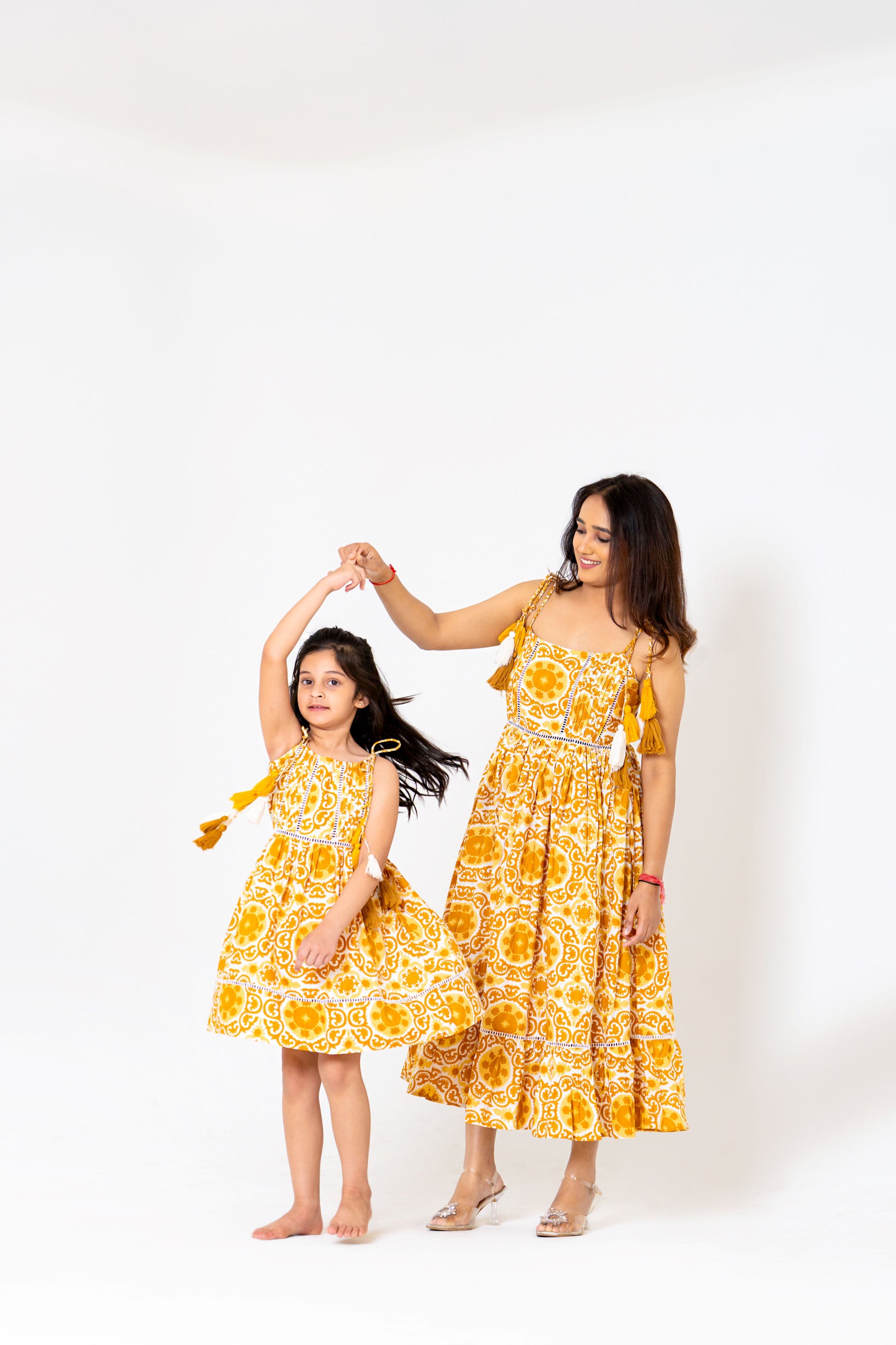 Mom & Daughter Mustard Yellow Floral Midi Dress β Twinning in Style
