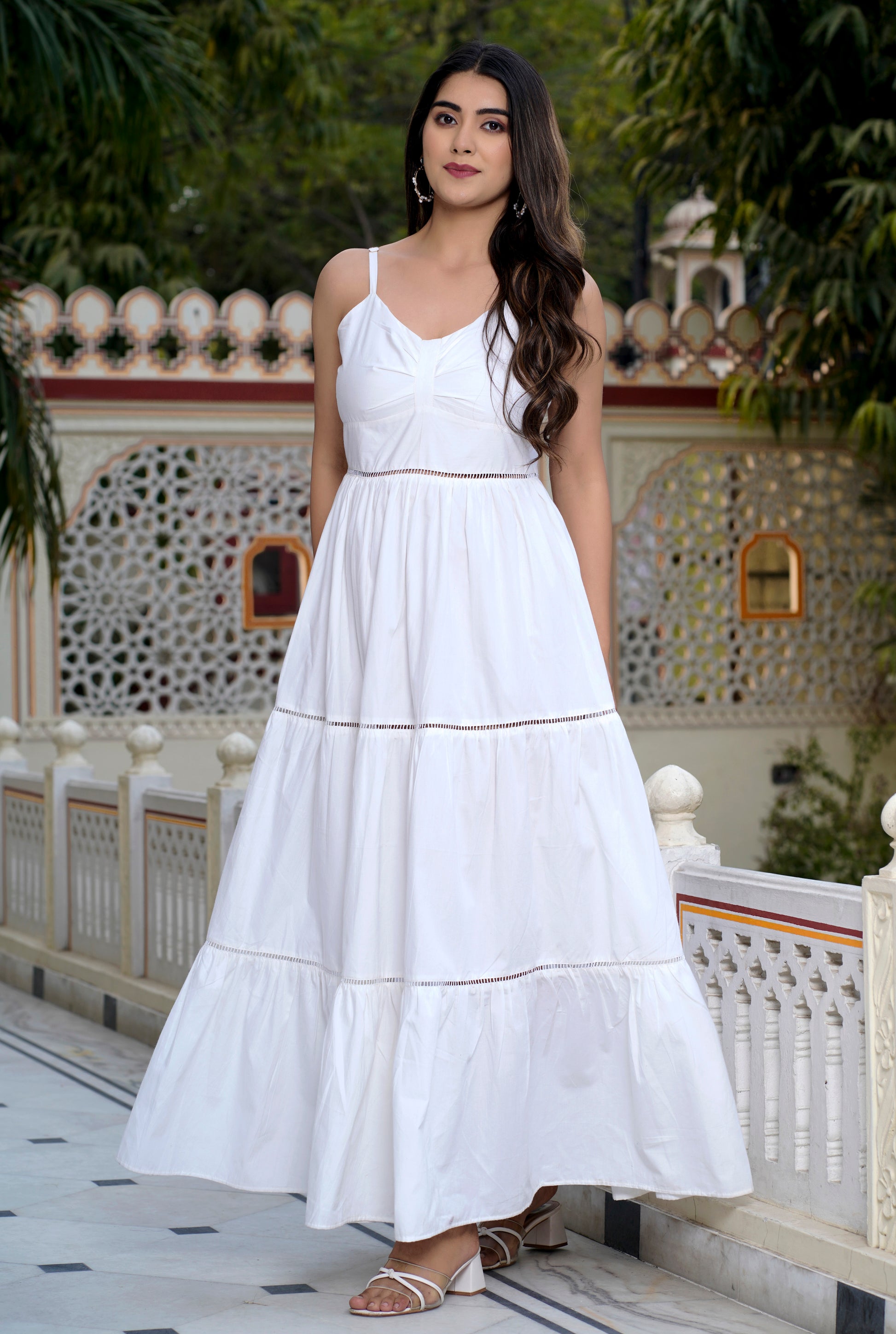 Step into effortless elegance with this stunning Pearl White 3-Tier Dress. Crafted from soft and breathable Cotton Poplin, this dress offers a crisp texture and a comfortable fit, perfect for all-day wear.