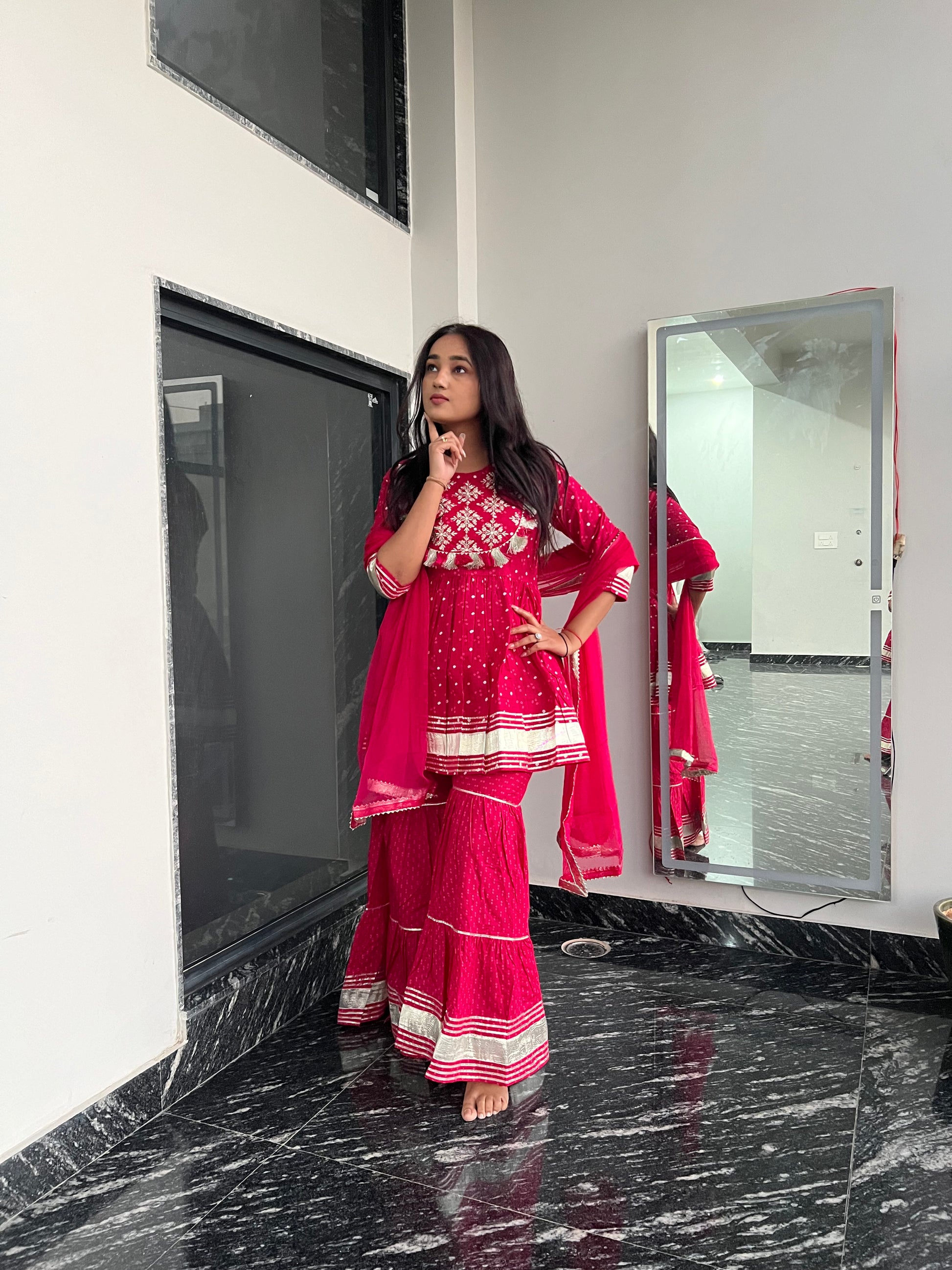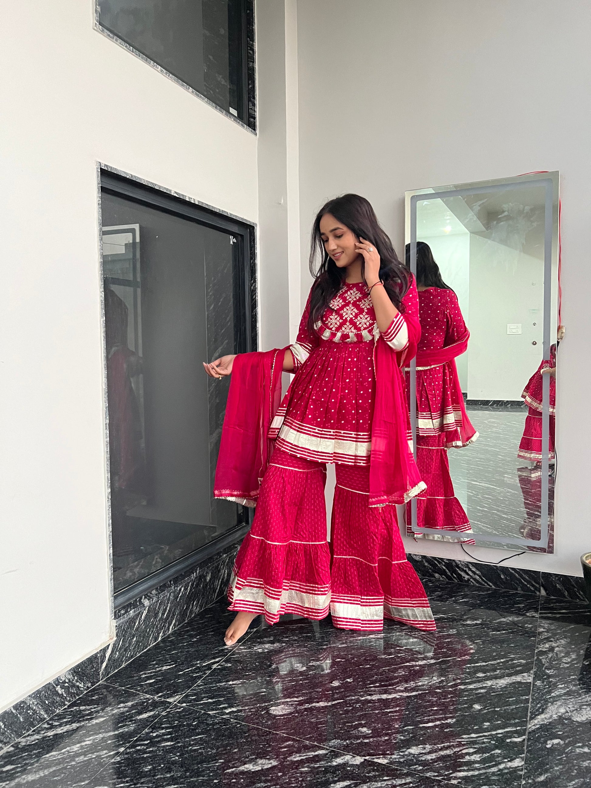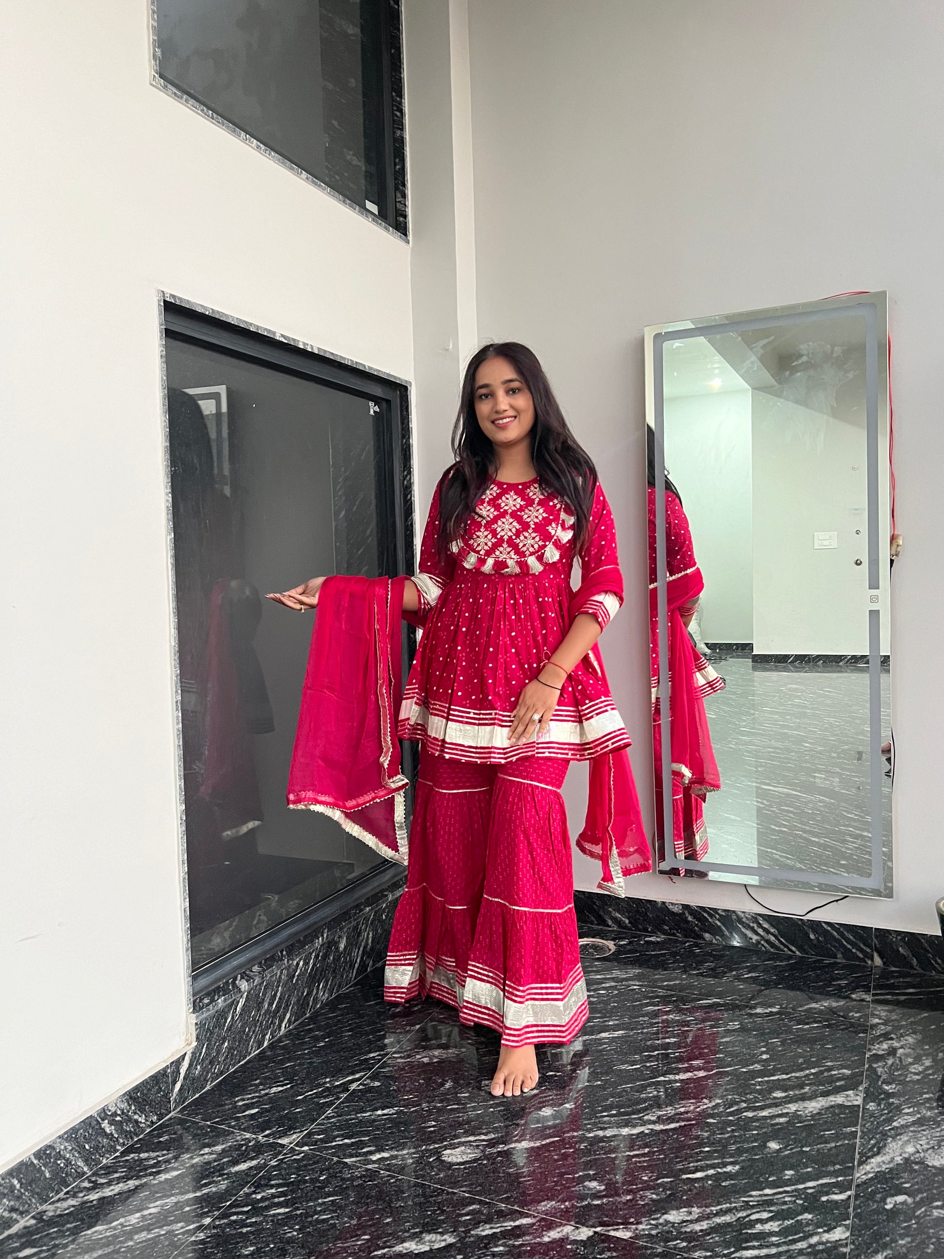 The elegance of traditional craftsmanship is brought to life with intricate mirror work and vibrant gota detailing.