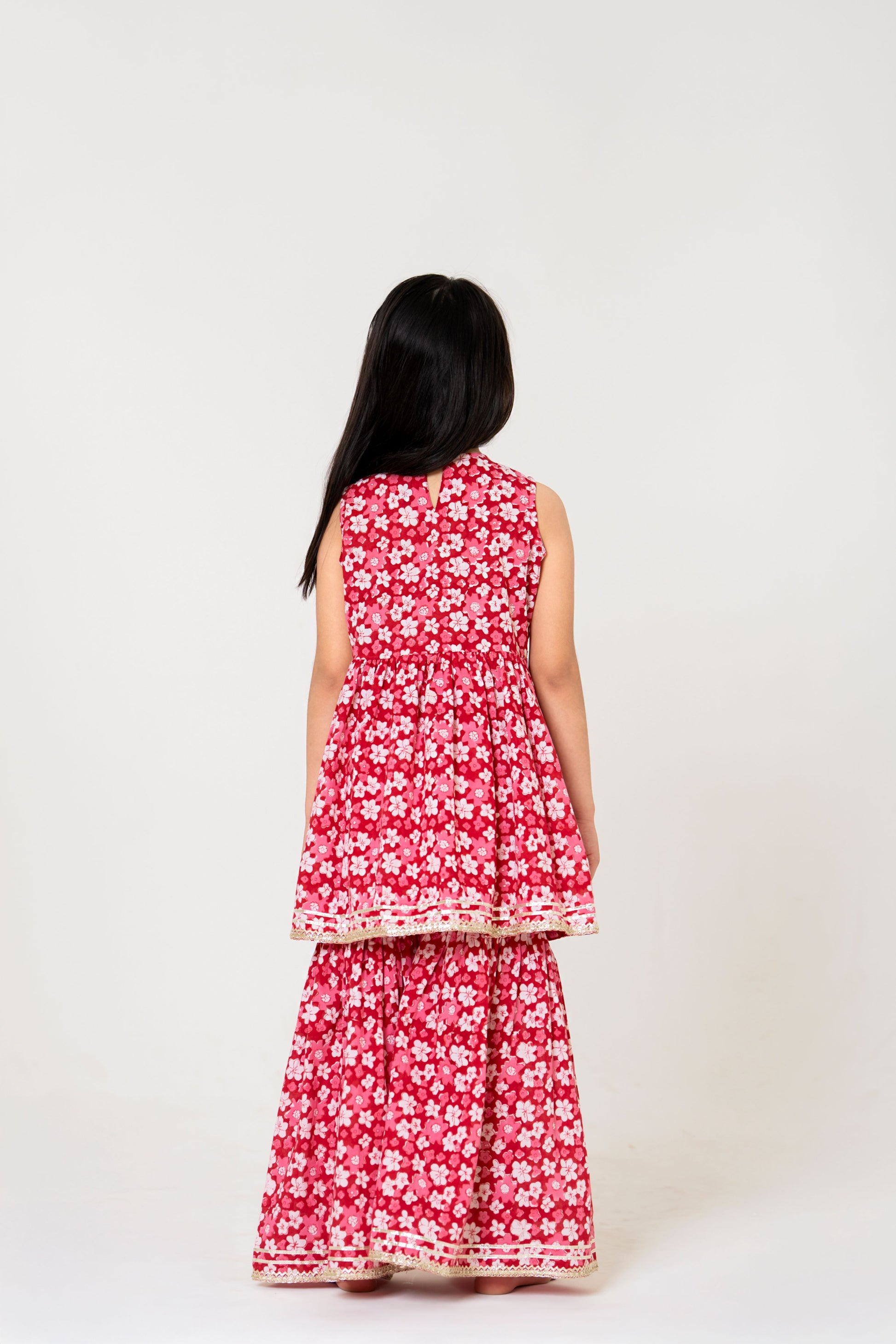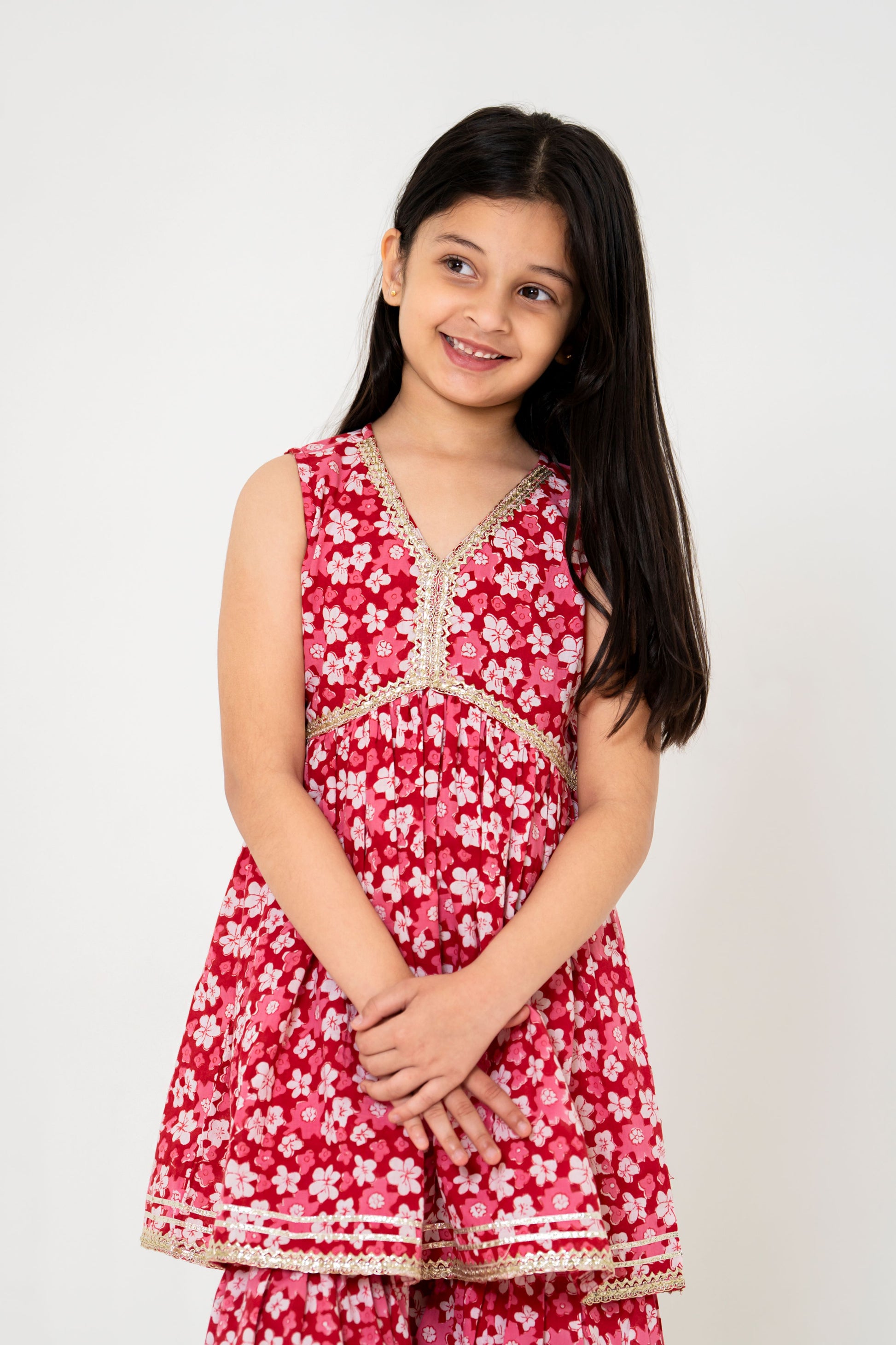 Add a vibrant touch to your little one's ethnic wardrobe with this stunning Red Jaipuri Kurti Sharara & Dupatta Set. Crafted from soft, breathable cotton fabric, this set offers comfort while radiating festive charm.