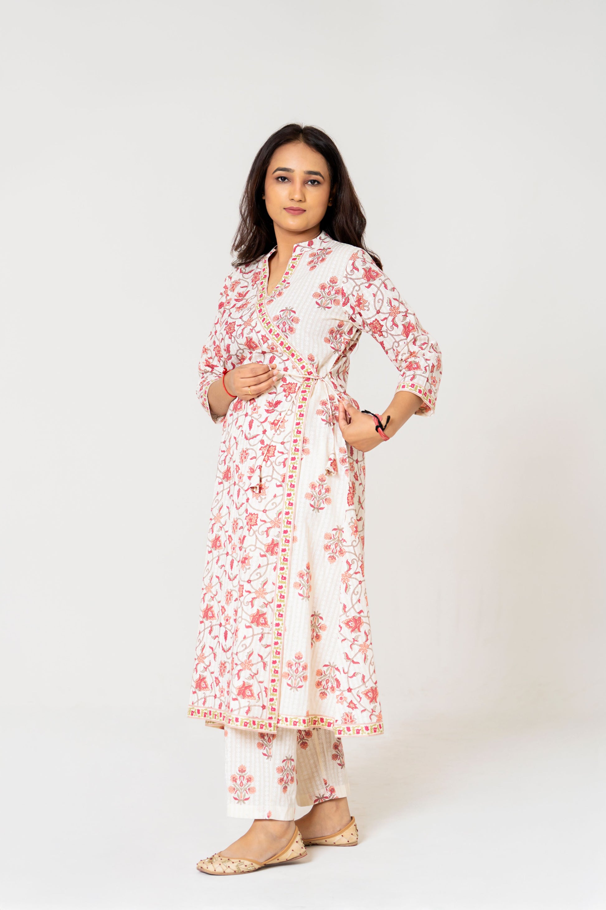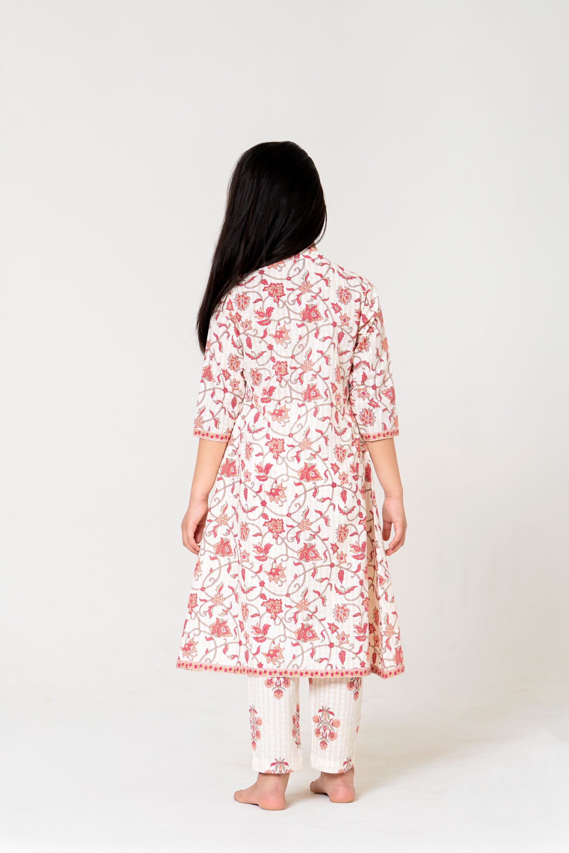 Celebrate the beauty of ethnic wear with this matching Off-White Jaipuri Floral Angrakha Kurta Set, perfect for mothers and daughters who love to twin in elegance. Crafted from pure cotton, this set offers comfort, style, and a timeless traditional appeal, making it ideal for festive occasions, family gatherings, and celebrations.