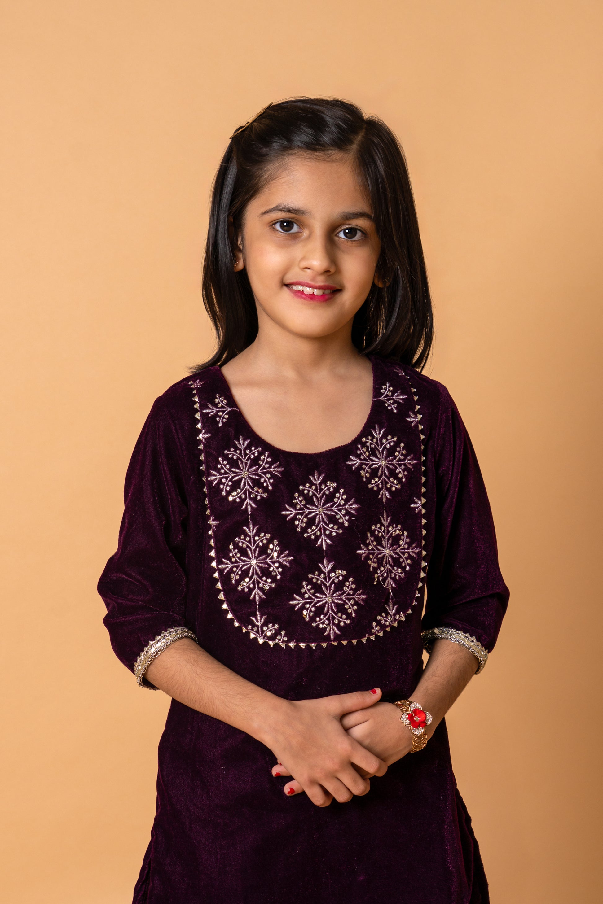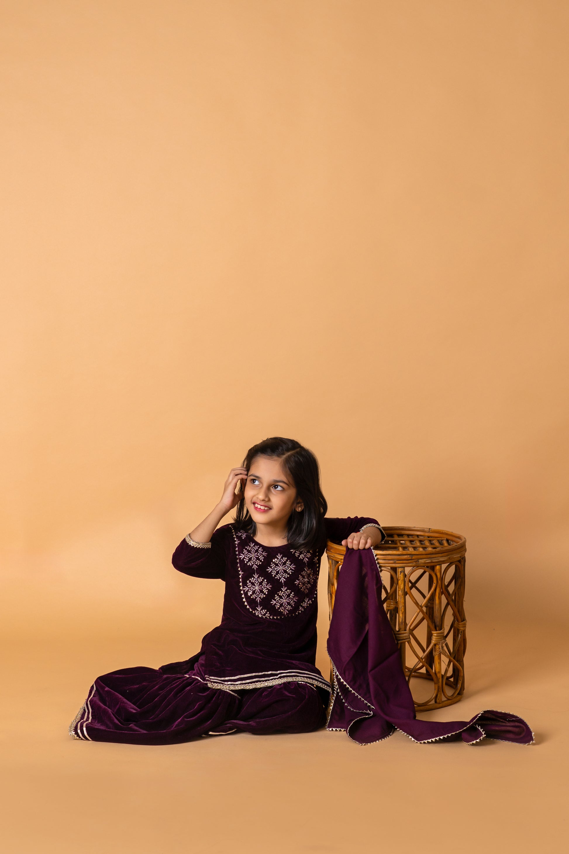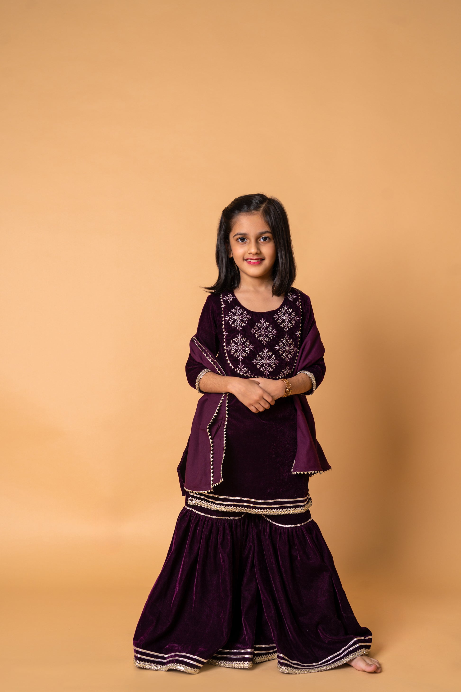 Wine Velvet Printed 3-pc Kurti, Sharara & Dupatta Set for Girls